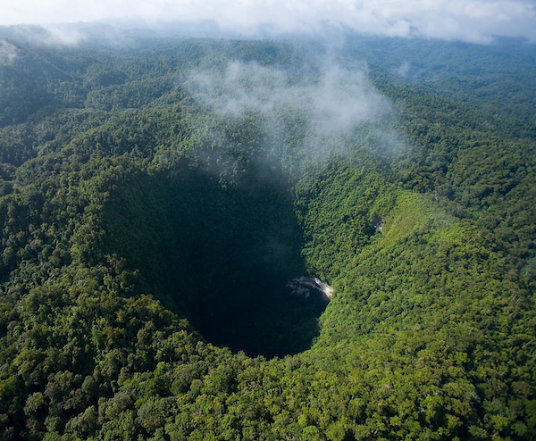 Minyé 天坑寬度達(dá)1148英尺(350米),這意味著四架波音747可以并肩齊驅(qū)橫穿深洞,甚至還能容納第五架飛機(jī)。據(jù)說(shuō)Minyé天坑是由地下河流與暴雨的沖刷形成的,石灰?guī)r受到侵蝕,導(dǎo)致了地表巖層的倒塌。