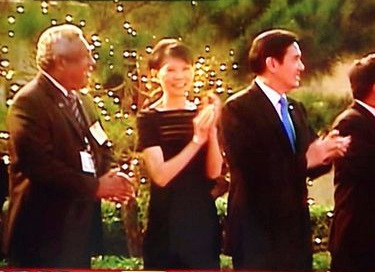 表演團(tuán)體穿過(guò)臺(tái)前,對(duì)著馬英九打招呼,這時(shí)候馬英九還在低頭看資料,渾然未覺(jué),夫人發(fā)現(xiàn),立刻用力頂了馬英九的手臂,馬英九這才趕緊擠出笑容,揮手致意,但可能是與王金平會(huì)面,氣氛實(shí)在太緊張,馬英九不斷猛摳手指,還有點(diǎn)恍神,這時(shí)周美青又再度撞了撞馬英九的手肘,要他往前看,周美青不斷跟王金平聊天,一旁的馬英九超好奇,不斷靠過(guò)去想偷聽(tīng)他們?cè)谡f(shuō)什么。