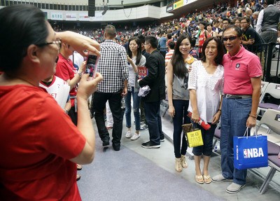 美國職籃(NBA)休斯敦火箭隊(duì)與印第安納步行者13日在臺北舉行熱身賽,鴻海集團(tuán)董事長郭臺銘(前右)與 妻子曾馨瑩(前右3)出席觀賽,引起注目。 圖自臺灣“中央社”