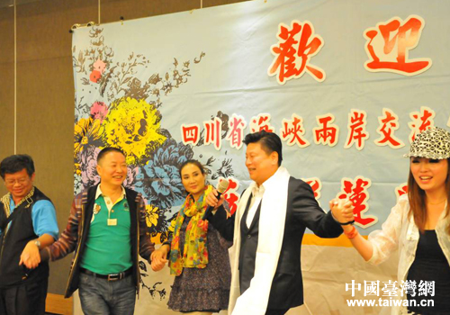 花蓮縣長(zhǎng)傅崐萁(右二)設(shè)宴歡迎四川民族歌舞赴臺(tái)交流團(tuán)一行,席間與交流團(tuán)一行手拉手跳藏族歌莊。