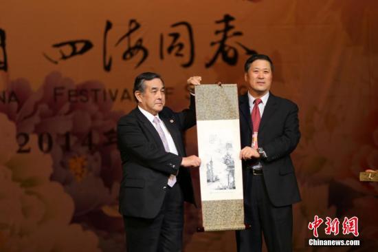 2月9日晚,2014年“文化中國四海同春”亞洲藝術(shù)團(tuán)在東京北千住1010劇場舉行了首演!拔幕袊 四海同春”是中國國務(wù)院僑辦自2009年春節(jié)開始打造的春節(jié)系列文化品牌活動。本次亞洲藝術(shù)團(tuán)共在馬來西亞,日本和韓國進(jìn)行6場演出。圖為亞洲團(tuán)團(tuán)長、暨南大學(xué)校長胡軍向東京華僑總會會長廖雅彥贈送紀(jì)念品。中新社發(fā) 高越 攝
