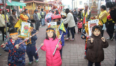 鹽水小學(xué)學(xué)生抬神轎到武廟慶祝蜂炮活動展開。來自臺媒