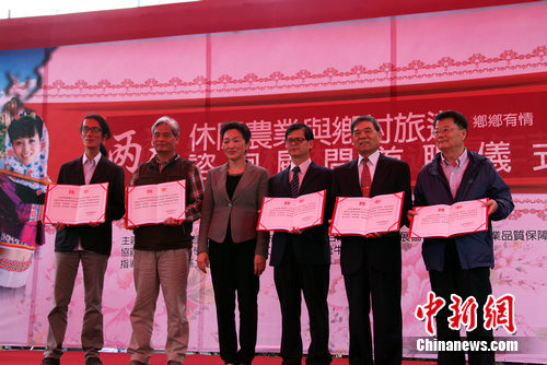 4月1日,“兩岸鄉(xiāng)村休閑旅游嘉年華”在臺灣苗栗縣飛牛牧場開幕。 活動由福建省旅游協(xié)會、臺灣鄉(xiāng)村旅游協(xié)會、臺灣休閑農(nóng)業(yè)發(fā)展協(xié)會、臺灣旅行業(yè)品質(zhì)保障協(xié)會聯(lián)合主辦。圖為福建方面聘任臺灣休閑農(nóng)業(yè)發(fā)展協(xié)會顧問邱涌忠、臺灣休閑農(nóng)業(yè)學(xué)會創(chuàng)會理事長陳昭郎、臺灣鄉(xiāng)村協(xié)會理事長鄭健雄等人為兩岸休閑農(nóng)業(yè)與鄉(xiāng)村旅游咨詢顧問,希望專家學(xué)者能夠為福建鄉(xiāng)村旅游發(fā)展獻計獻策。(左3)為福建省旅游協(xié)會會長朱華。