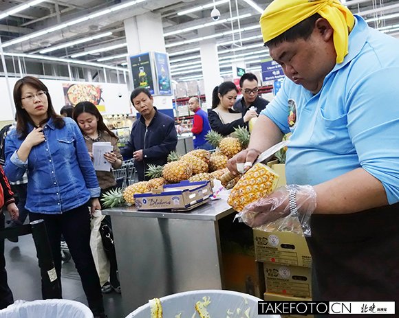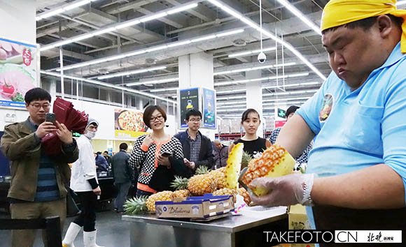 2014年4月2日 來自臺(tái)灣的金牌快刀手林志龍蟬聯(lián)10多年臺(tái)灣削鳳梨冠軍,曾經(jīng)創(chuàng)造6秒鐘削一個(gè)鳳梨的紀(jì)錄。昨天,林志龍?jiān)谖譅柆斏侥窌?huì)員店內(nèi)秀他的刀法。