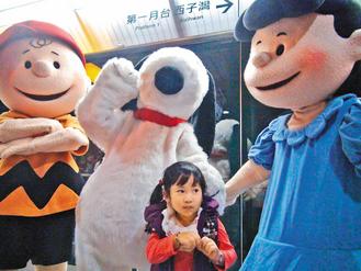 史努比、查理布朗以及露西等玩偶現(xiàn)身彩繪列車,小朋友開心地與玩偶一起搭高捷。(記者謝梅芬 攝影)