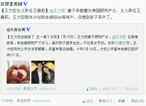 據(jù)臺(tái)媒報(bào)道,王力宏 妻子李靚蕾昨天在美國(guó)順利產(chǎn)女,女兒取名為王嘉莉。王力宏原本計(jì)劃和老婆回臺(tái)灣待產(chǎn),沒(méi)想到孩子早產(chǎn)了1月?lián)ぃ趿耆膛惝a(chǎn),公布喜訊后還開(kāi)心地表示,從小就希望能擁有自己的小孩的夢(mèng)想如今終于實(shí)現(xiàn)了。