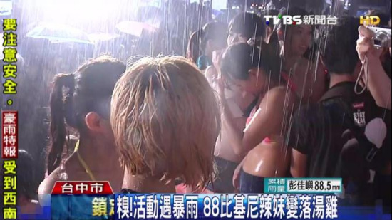 中新網(wǎng)8月9日電 據(jù)臺灣TVBS網(wǎng)站消息,號稱全臺中最大的水湳夜市,在“爸親節(jié)”(臺灣8月8日為爸爸節(jié))找來88位比基尼辣妹,要免費替逛夜市的爸爸們按摩,每按一個,攤商就要捐10元新臺幣給高雄氣爆賑災(zāi),但沒想到8號晚上,臺中市突然下起大雷雨,雨勢又大又急,不但活動辦不成,就連這些辣妹,全身上下都被雨水淋濕,當(dāng)場變成素顏。