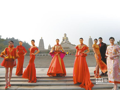 身材高挑的模特兒身穿中式禮服,走在佛陀紀(jì)念館成佛大道,吸引眾人目光。(圖:臺灣《旺報》)