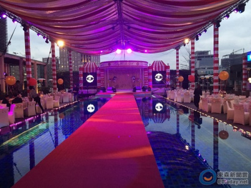 據(jù)臺灣“東森新聞”報道,周杰倫日前在英國辦完超豪華世紀婚禮,9日在臺北W Hotel補辦戶外婚禮,現(xiàn)場許多演藝圈大腕好友紛紛到場祝賀。而婚禮內(nèi)場也隨之曝光,風格大吹俏皮馬戲團風,除了有多張小倆口甜蜜合照,紅毯架在泳池上,左右都是水,看起來相當浪漫。