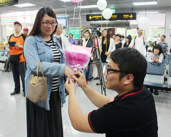 中新網(wǎng)5月29日電 據(jù)臺(tái)灣“中央社”報(bào)道,金門文創(chuàng)商品“風(fēng)伯燒”的老板王家進(jìn),28日在機(jī)場(chǎng)捧著白色花菜,向交往5年的女友郭佑偵求婚。
