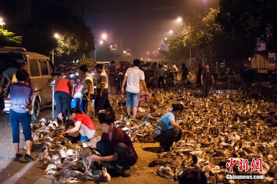 8月27日是農(nóng)歷七月十四,廣西人俗稱“鬼節(jié)”,民眾有吃鴨子的習(xí)俗。當(dāng)日凌晨,在廣西柳州市航生北路,商家將十萬余只鴨子鋪滿道路進(jìn)行批發(fā)售賣,數(shù)百米的街道上滿街都是鴨子,叫聲不絕,空氣中彌漫著家禽的氣味。無數(shù)商販通宵進(jìn)行采買,這一天也是當(dāng)?shù)匾荒曛续喿愉N量最大的時(shí)候,而這樣通宵滿街賣鴨子的場(chǎng)景已持續(xù)了十余年。