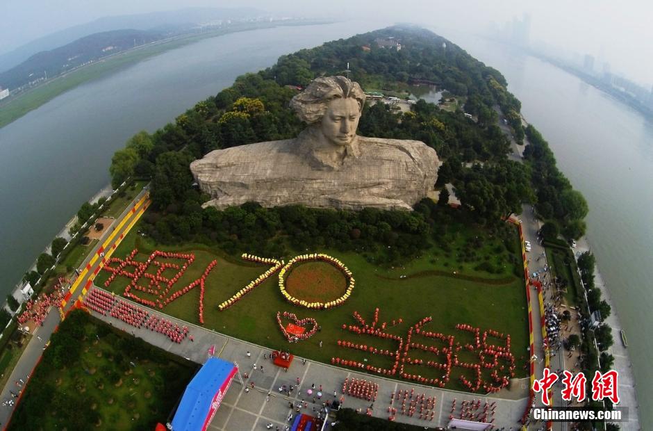 8月30日,在長(zhǎng)沙橘子洲頭青年毛澤東塑像前,近千名來(lái)自湖南省內(nèi)的青少年與廣場(chǎng)舞大媽集結(jié)于此,用人體隊(duì)形拼成了“中國(guó)人當(dāng)自強(qiáng)”和象征著中國(guó)人民抗戰(zhàn)勝利70周年的“70”字樣,以此展示湖南人敢為人先的愛(ài)國(guó)精神,紀(jì)念中國(guó)人民抗戰(zhàn)勝利70周年。楊華峰 攝