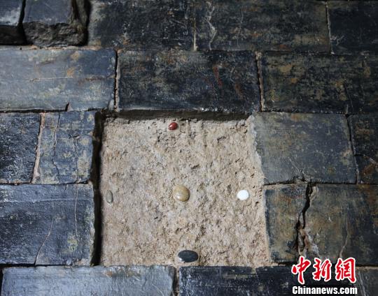 此外,在棺床中部,還發(fā)現(xiàn)了一個金井,呈正方形,邊長40厘米,深6厘米,中間擺放著五種顏色的鵝卵石,其中,黑、紅、青、白四色分別放置于金井的北、南、東、西四個方向,中間一顆為黃色,體積略大于其它四顆,這樣的“五色石陣”意義何在,要等待史學專家的解釋。