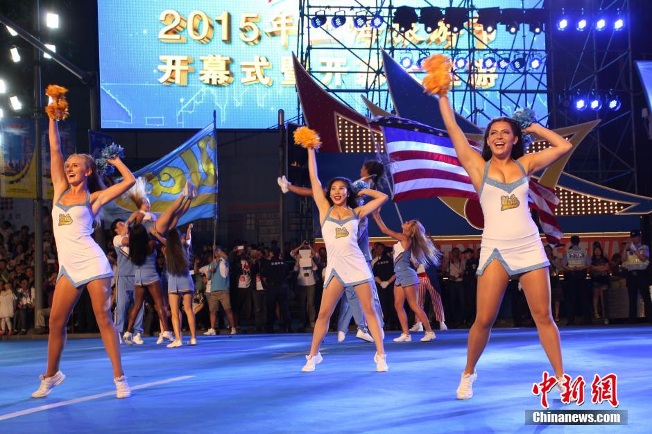 9月12日晚,上海淮海路流光溢彩,第26屆上海旅游節(jié)拉開帷幕。來(lái)自19個(gè)國(guó)家和地區(qū)的23輛花車和31支表演方隊(duì),圍繞著“海上絲路”這一主題,全方位地展示“一帶一路”沿線城市和地區(qū)的風(fēng)采。圖為美國(guó)加州大學(xué)洛杉磯分校(UCLA)啦啦隊(duì)表演隊(duì)亮相。 張亨偉 攝
