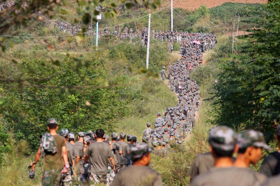 9月15日,湖北襄陽市,湖北文理學(xué)院近四千名大學(xué)一年級(jí)新生在隆中山上進(jìn)行十公里拉練。
