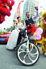 據(jù)新娘王祺菲介紹,她是膠州人,畢業(yè)于中央民族大學(xué)音樂系。2012年,她在北京一家教育培訓(xùn)機(jī)構(gòu)任教,而她的老公Karol任外教。由于兩人都愛好戶外運(yùn)動(dòng),一次偶然的機(jī)會(huì),兩人在騎行活動(dòng)中相識(shí),Karol是個(gè)中國(guó)通,加拿大多倫多人,幽默風(fēng)趣性格讓她產(chǎn)生好感,最終兩人走到了一起。王祺菲還向記者透露,Karol的父親是波蘭移民,還是環(huán)法自行車賽冠軍,Karol遺傳了父親的愛好,酷愛戶外自行車運(yùn)動(dòng),這才讓她倆走到了一起。既然是因自行車結(jié)緣,兩人一商量,決定用這個(gè)特別的方式舉辦婚禮,沒有奢華的車隊(duì)一樣很快樂,更重要的是能夠?qū)⑦@種環(huán)保低碳的概念一路傳遞給大家,更有紀(jì)念意義。