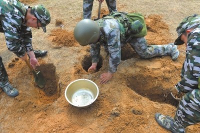 凌晨緊急集合,全副武裝負(fù)重50斤野外徒步20公里,躲避“敵人”雷達(dá)衛(wèi)星偵察迅速隱蔽、路遇小波敵人騷擾迅速殲滅、35秒內(nèi)戴上防毒面具穿越染毒地帶、搭建駐扎帳篷、挖坑埋灶做飯……