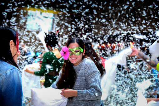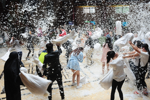 午休時(shí),戴上面具的員工們還玩起了枕頭大戰(zhàn),千古情主題酒店的大堂飄起了一場(chǎng)“鵝毛大雪”,戴上面具后大家不再有職位上的區(qū)別,甚至公司的總經(jīng)理也加入到了這場(chǎng)枕頭大戰(zhàn)之中。每個(gè)人都不甘落后,揮起枕頭,用“柔軟的暴力”,盡情宣泄生活的壓力。