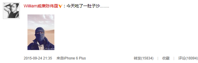 騰訊娛樂訊 近日,陳偉霆與阿Sa相互發(fā)聲明表示和平分手,但港媒卻曝出他們分手的原因其實(shí)是陳偉霆一手策劃的。昨晚,陳偉霆通過微博曬出沙漠蒙面照,并寫道:“今天吃了一肚子沙……”照片中,陳偉霆置身沙漠中,全副武裝,用圍巾將頭和臉部裹得嚴(yán)嚴(yán)實(shí)實(shí),僅露出眼睛,悠閑自得似乎懶理各種傳聞。