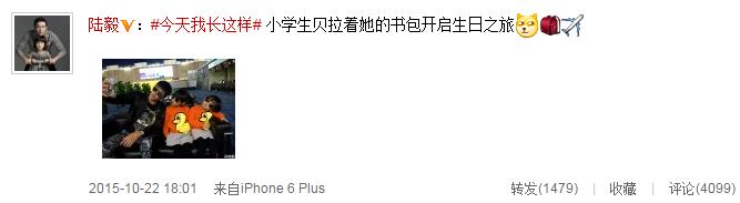 中新網(wǎng)10月22日電 今日,陸毅在微博曬出與兩個女兒在機(jī)場的合照,并稱:“小學(xué)生貝拉著她的書包開啟生日之旅!闭掌,三人都戴著墨鏡,陸毅穿著黑色外套,造型酷炫,兩個女兒則穿著橘黃色卡通上衣,十分可愛。另一張中,貝兒還沖著爸爸陸毅伸舌頭,很是頑皮。