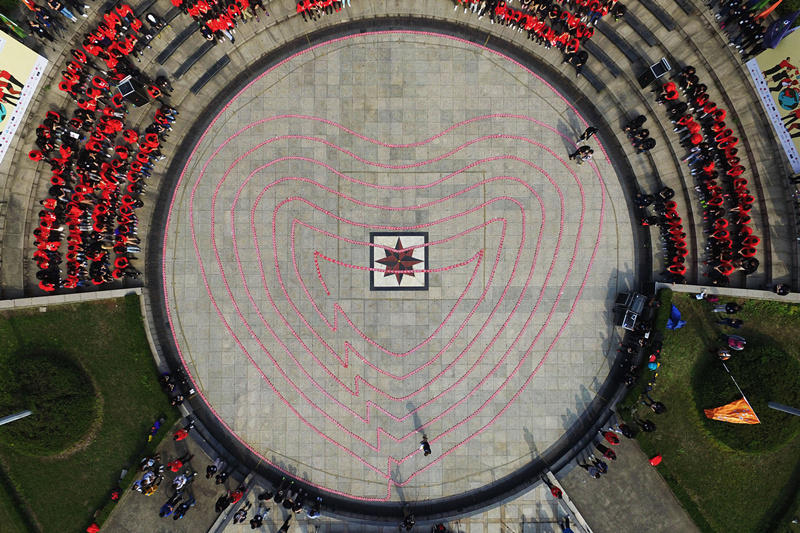 10月26日,浙江省杭州市,浙江中醫(yī)藥大學(xué)杭州濱江校區(qū)內(nèi),300名大學(xué)生及公益使者共同將3004只內(nèi)裝祈福卡的信封連接成一條總長(zhǎng)達(dá)335.23米的心形信封鏈條,刷新了今年8月由“全球成長(zhǎng)心連心”國(guó)際協(xié)會(huì)組織華人大學(xué)生在加拿大多倫多首創(chuàng)的由2409只連接而成的世界最長(zhǎng)信封鏈條吉尼斯紀(jì)錄。