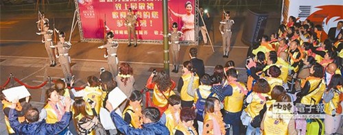 為了歡迎大陸來的頂級消費群,該集團特地找來臺軍打扮的儀隊,在游輪?康母劭冢哉y(tǒng)軍禮儀式迎賓,前方帶隊的阿兵哥,雄糾糾、氣昂昂地揮劍引導(dǎo)后方花槍隊伍,儀式演出一結(jié)束,立刻引來貴婦蜂擁而上、搶拍合照。入臺后貴婦團展開為期5天的環(huán)島之旅。