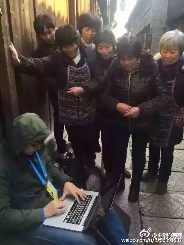 記者在第二屆世界互聯(lián)網(wǎng)大會舉辦地烏鎮(zhèn)采訪完后正在趕稿,無意中被一群大媽圍觀了。同行的小伙伴隨手記錄下了這個(gè)畫面。