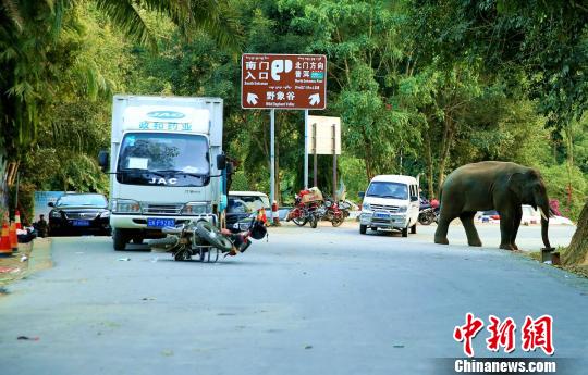 圖為新晉“網(wǎng)紅”野象“獨筍牙”又溜到野象谷大門攔路玩車 常宗波 攝