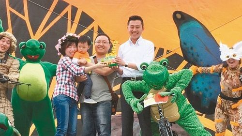 伊索動物園4月4日喜迎第10萬名訪客李先生一家,市長林智堅(jiān)(右)贈送長頸鹿樂高與腳踏車。來源:臺灣《聯(lián)合報(bào)》