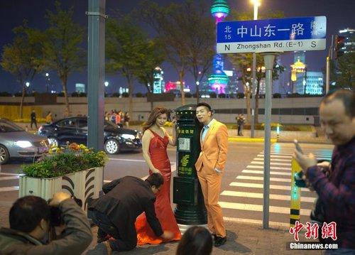 4月11日,市民在上海中山東一路“鹿晗合影郵筒”旁拍婚紗照。4月8日,明星鹿晗在微博上發(fā)布一張?jiān)谥猩綎|一路與郵筒合影的照片。這只郵筒隨之成為網(wǎng)紅,大量鹿晗粉絲前來與之合影,人數(shù)多的時(shí)候,粉絲們還排起了長隊(duì)。