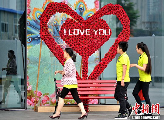 5月20日,福州一家商場(chǎng)為了招攬生意,用塑料制作的玫瑰花搭起一個(gè)愛心,營(yíng)造出濃濃的愛意。隨著520被賦予“我愛你”的寓意,近年來(lái),這個(gè)日子迅速走俏,許多商家也在這一天舉行各種活動(dòng),搶抓商機(jī)。中新社記者 張斌 攝