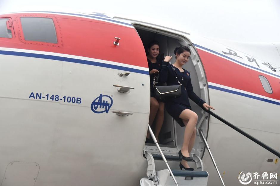 5月31日下午16:40分,朝鮮高麗航空J(rèn)S561次航班首次順利抵達(dá)濟(jì)南國際機(jī)場,平壤—濟(jì)南航線成功開通。在經(jīng)過嚴(yán)格的邊防檢查后,3名朝鮮空姐和7名乘務(wù)人員,他們身著統(tǒng)一的深藍(lán)色空乘制服,右胸前統(tǒng)一佩戴著印有金日成、金正日的紅色胸章,面帶微笑走出機(jī)艙。(齊魯網(wǎng)記者 滿倩 劉玉良 攝)圖片來源:齊魯網(wǎng)