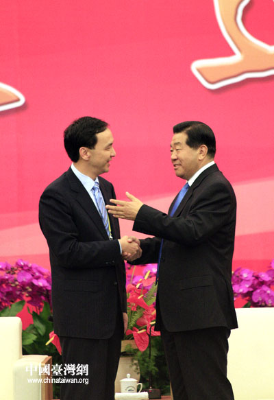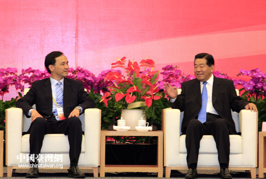 中共中央政治局常委、全國政協(xié)主席賈慶林會見中國國民黨副主席朱立倫。(中國臺灣網(wǎng) 鐘寶華 攝)