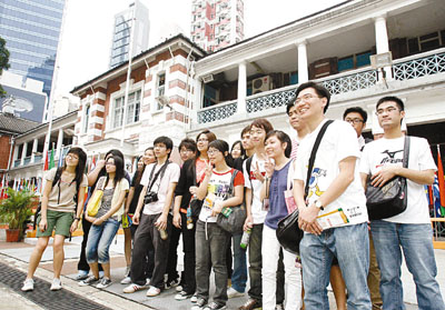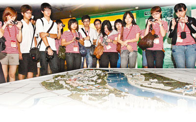 在700天時間里,世博展巡回了21個省區(qū)市和港澳臺地區(qū)。圖為臺灣大學(xué)生參觀上海世博園區(qū)規(guī)劃模型。