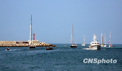 7月31日上午9時(shí)許,參加第一屆海峽杯帆船賽的兩岸運(yùn)動(dòng)帆船列隊(duì)進(jìn)入賽事終點(diǎn)安平港。圖為多艘帆船在臺(tái)灣方面護(hù)衛(wèi)船只引領(lǐng)下入港。 中新社發(fā) 劉舒凌 攝