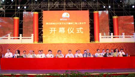 6月16日晚,以“我們的節(jié)日 端午”為主題的第四屆閩臺(tái)對(duì)渡文化節(jié)暨蚶江海上潑水節(jié)開(kāi)幕式,在中國(guó)休閑服裝名城——石獅市舉行。開(kāi)幕式上,大型民俗表演地方特色濃郁,陣容龐大,演出內(nèi)容精彩絕倫,尤其是臺(tái)灣風(fēng)情舞蹈令人贊嘆。