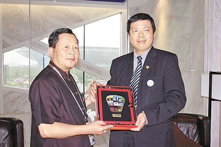 苗栗縣長劉政鴻(左)與12位縣議員參觀上海世博臺(tái)灣館,表達(dá)買下臺(tái)灣館的充分誠意,由總館長葉明水致贈(zèng)紀(jì)念品,紀(jì)念品正是一幅臺(tái)灣館天燈紀(jì)念徽章拼圖組。圖片來源:中國時(shí)報(bào)