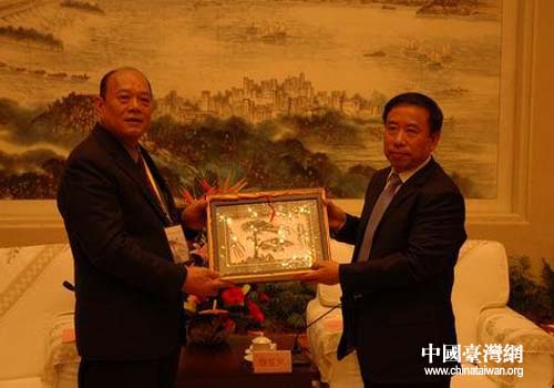 安徽省委常委、省委秘書(shū)長(zhǎng)詹夏來(lái)向臺(tái)灣云林縣議員參訪團(tuán)贈(zèng)送禮品(圖片來(lái)源:安徽省臺(tái)辦)