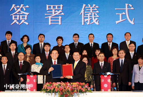 海協(xié)會會長陳云林和海基會董事長江丙坤正式簽署《海峽兩岸醫(yī)藥衛(wèi)生合作協(xié)議》。(中國臺灣網(wǎng) 鐘寶華 攝)