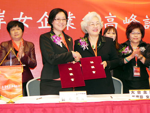 “第一屆兩岸女企業(yè)家高峰論壇”6日在臺(tái)北舉行,臺(tái)灣女企業(yè)家協(xié)會(huì)創(chuàng)會(huì)理事長(zhǎng)馬愛(ài)珍和中華全國(guó)工商聯(lián)女企業(yè)家商會(huì)會(huì)長(zhǎng)、劉少奇之女劉亭代表雙方簽訂合作備忘錄。