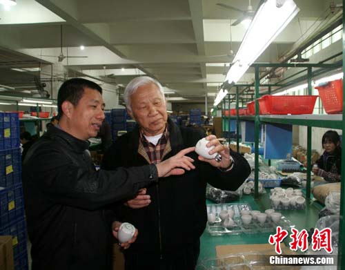 2月15日,在東山椿益塑膠制品有限公司生產(chǎn)車間,72歲的臺商、公司副董事長呂文吉先生 (右)與技術(shù)員忙著嚴把產(chǎn)品質(zhì)量關(guān)。