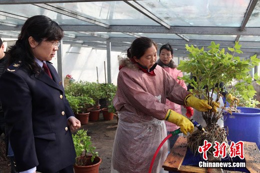 洛陽出入境檢驗(yàn)檢疫局工作人員正在對參展牡丹生長情況進(jìn)行觀察。