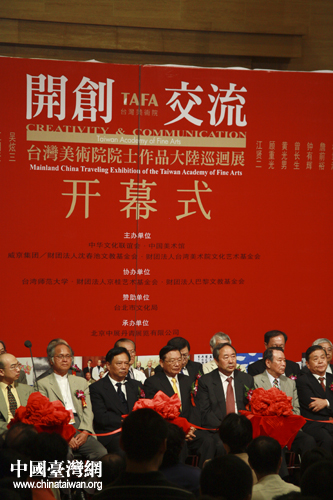 中國(guó)臺(tái)灣網(wǎng)8月22日北京消息 22日上午,由中華文化聯(lián)誼會(huì)、中國(guó)美術(shù)館、臺(tái)灣沈春池文教基金會(huì)、臺(tái)灣美術(shù)院文化藝術(shù)基金會(huì)主辦的《開創(chuàng)·交流——臺(tái)灣美術(shù)院院士作品大陸巡回展》在北京中國(guó)美術(shù)館隆重開幕。臺(tái)灣;鶗(huì)董事長(zhǎng)江丙坤、中華文化聯(lián)誼會(huì)顧問周和平、全國(guó)臺(tái)灣同胞聯(lián)誼會(huì)會(huì)長(zhǎng)梁國(guó)揚(yáng)、海協(xié)會(huì)副會(huì)長(zhǎng)王富卿等兩岸各界嘉賓300余人出席了展覽開幕式。
