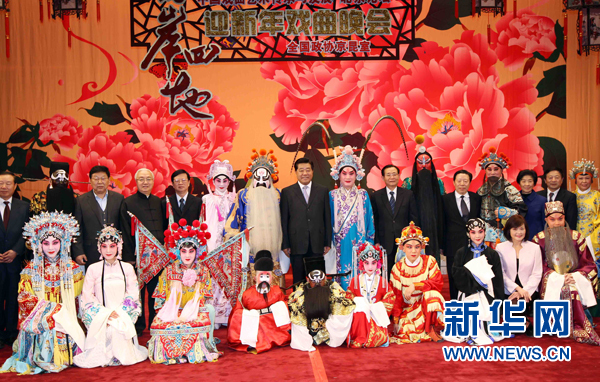 12月21日,“兩岸四地中國戲曲藝術(shù)傳承與發(fā)展·北京論壇”在北京全國政協(xié)禮堂舉辦戲曲晚會。中共中央政治局常委、全國政協(xié)主席賈慶林出席觀看。這是演出結(jié)束后,賈慶林同演職人員合影。新華社記者 劉衛(wèi)兵 攝