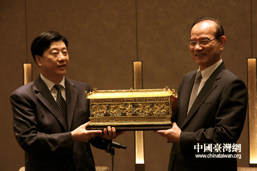 會(huì)見(jiàn)結(jié)束后雙方互贈(zèng)禮物。(中國(guó)臺(tái)灣網(wǎng) 馬迪 攝)