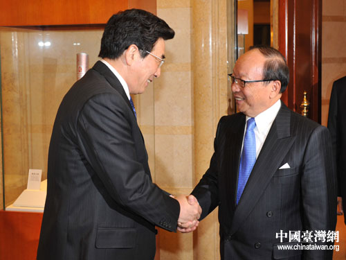 中共中央政治局委員、北京市委書記郭金龍21日下午會見了出席第15屆京臺科技論壇暨2012北京臺灣名品博覽會的中國國民黨副主席蔣孝嚴(yán)一行。國臺辦主任王毅一同參加會見。(北京臺辦丁磊 攝)