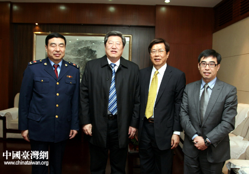 山東省政府特邀咨詢張建國(左二)、省工商局局長牛啟忠在晚會(huì)前與臺(tái)灣來賓合影。
