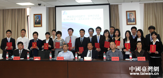 中國(guó)臺(tái)灣網(wǎng)5月21日北京消息 5月21日上午,由中國(guó)人民大學(xué)和臺(tái)灣漢青兩岸基金會(huì)共同舉辦的2013年度“漢青兩岸暨中美關(guān)系研究獎(jiǎng)學(xué)金”頒獎(jiǎng)儀式在人民大學(xué)明德國(guó)際樓舉行,18名兩岸優(yōu)秀學(xué)子被獲予此項(xiàng)殊榮。漢青兩岸基金會(huì)創(chuàng)辦人、臺(tái)灣中國(guó)文化大學(xué)美國(guó)研究所所長(zhǎng)、人民大學(xué)國(guó)際關(guān)系學(xué)院客座教授陳毓鈞,國(guó)務(wù)院臺(tái)辦研究局副局長(zhǎng)張黎宏,全國(guó)臺(tái)灣研究會(huì)副秘書長(zhǎng)楊立憲,中國(guó)人民大學(xué)國(guó)際關(guān)系學(xué)院院長(zhǎng)陳岳等二十余位涉臺(tái)專家參與頒獎(jiǎng)活動(dòng)。