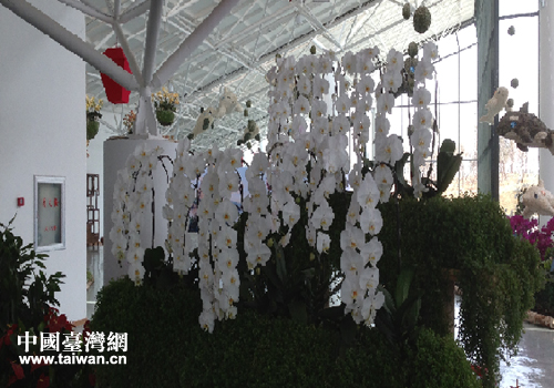 在二區(qū),來自臺灣的花藝師鐘珮淇介紹道:“臺灣是著名的蘭花王國。在這里,我們以聞名世界的蝴蝶蘭作為主要元素,以花藝融入景觀的創(chuàng)作,力求呈現(xiàn)完美的花、藝、景合一的效果!彼钢渲械囊环N白色蘭花說:“這個品種的蝴蝶蘭名為‘臺灣阿媽’,是臺灣最珍貴的蘭花品種,曾為臺灣榮獲過第一個國際蘭花金獎,現(xiàn)在已有70%的臺灣蘭花都是從這個品種繁育出來的!