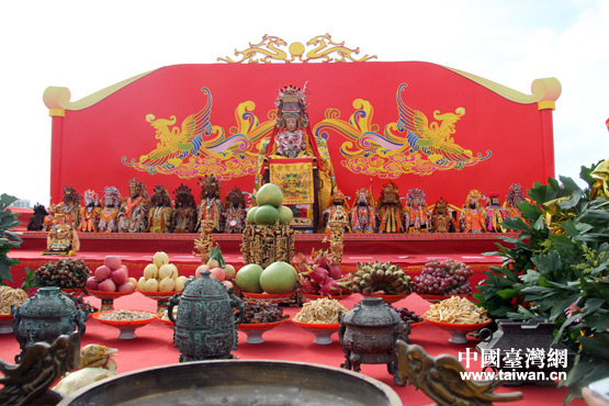 8月1日上午,2013兩岸媽祖佑南疆祈福祭典儀式在海南潭門港舉行。圖為擺放在祭祀臺上的兩岸媽祖像。(中國臺灣網 李丹 攝)